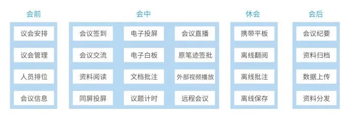 會議資料查看、批注、投票、同屏、電子白板、投影、會議服務、會議管理等功能。